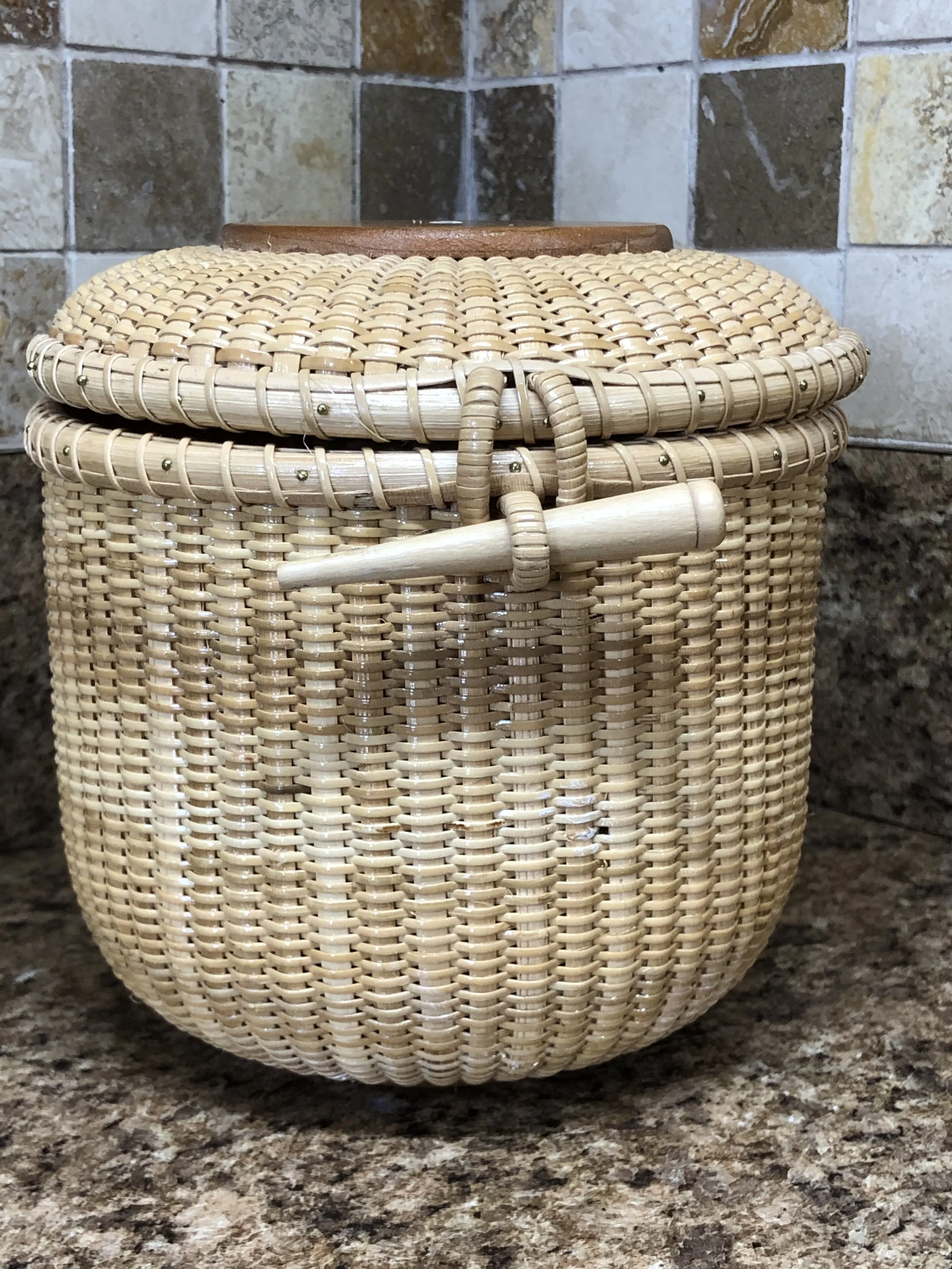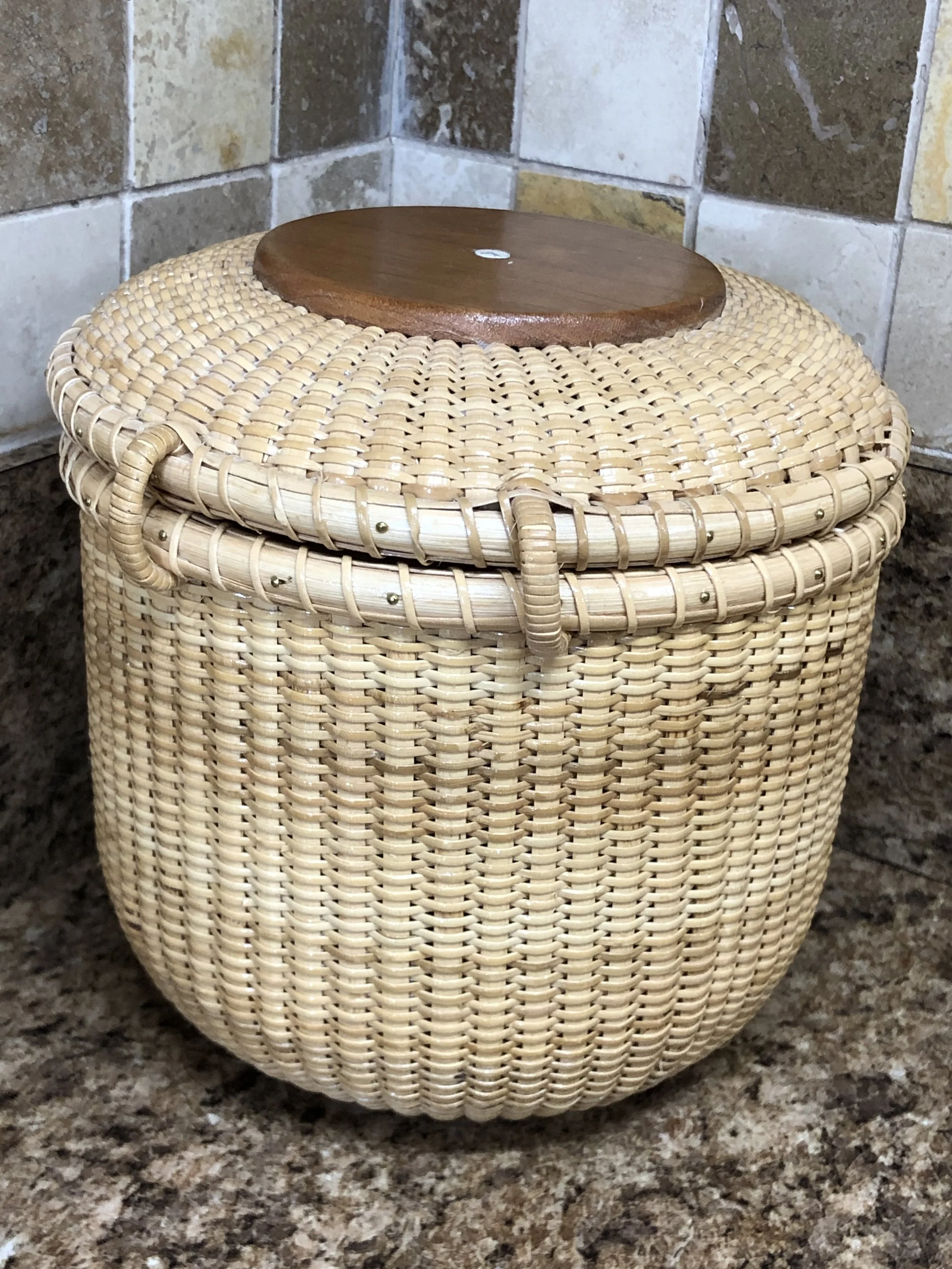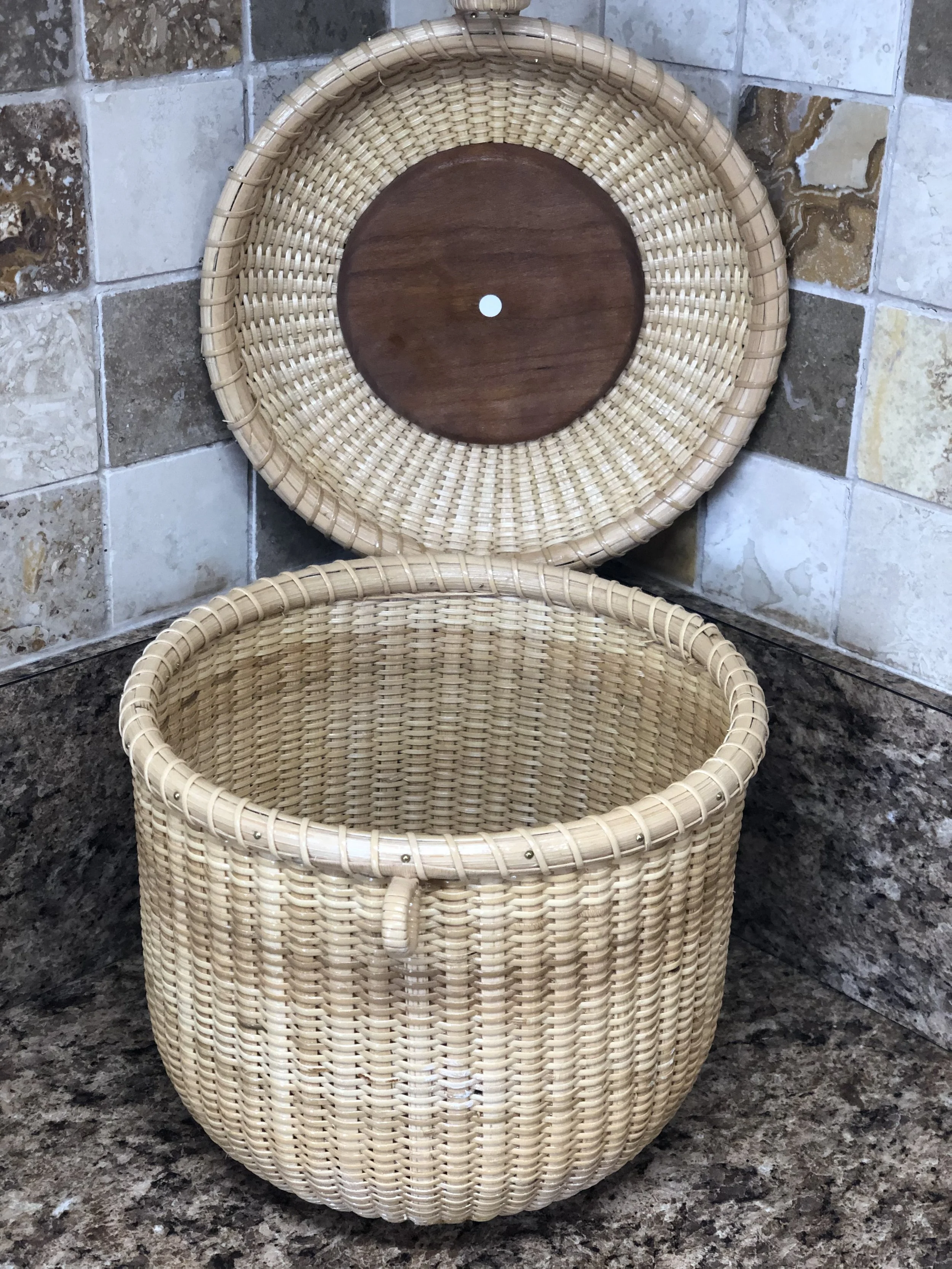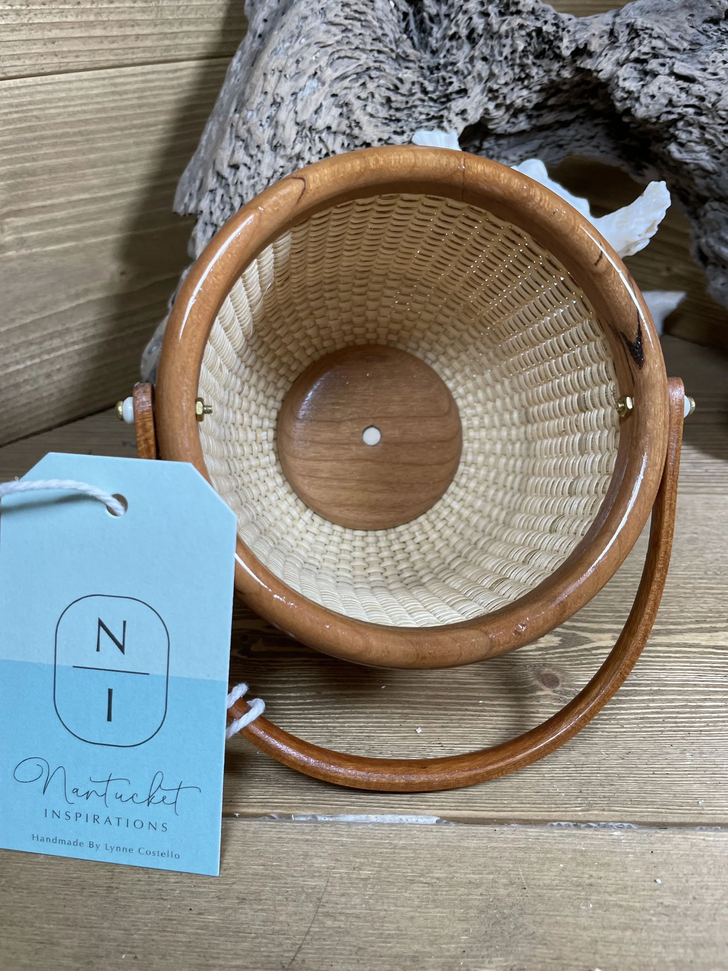 This 4” round basket is created using the same methods that the whalers used on the light ships during whaling. It has a cherry hardwood base, rim, knob and is woven using premium cane.